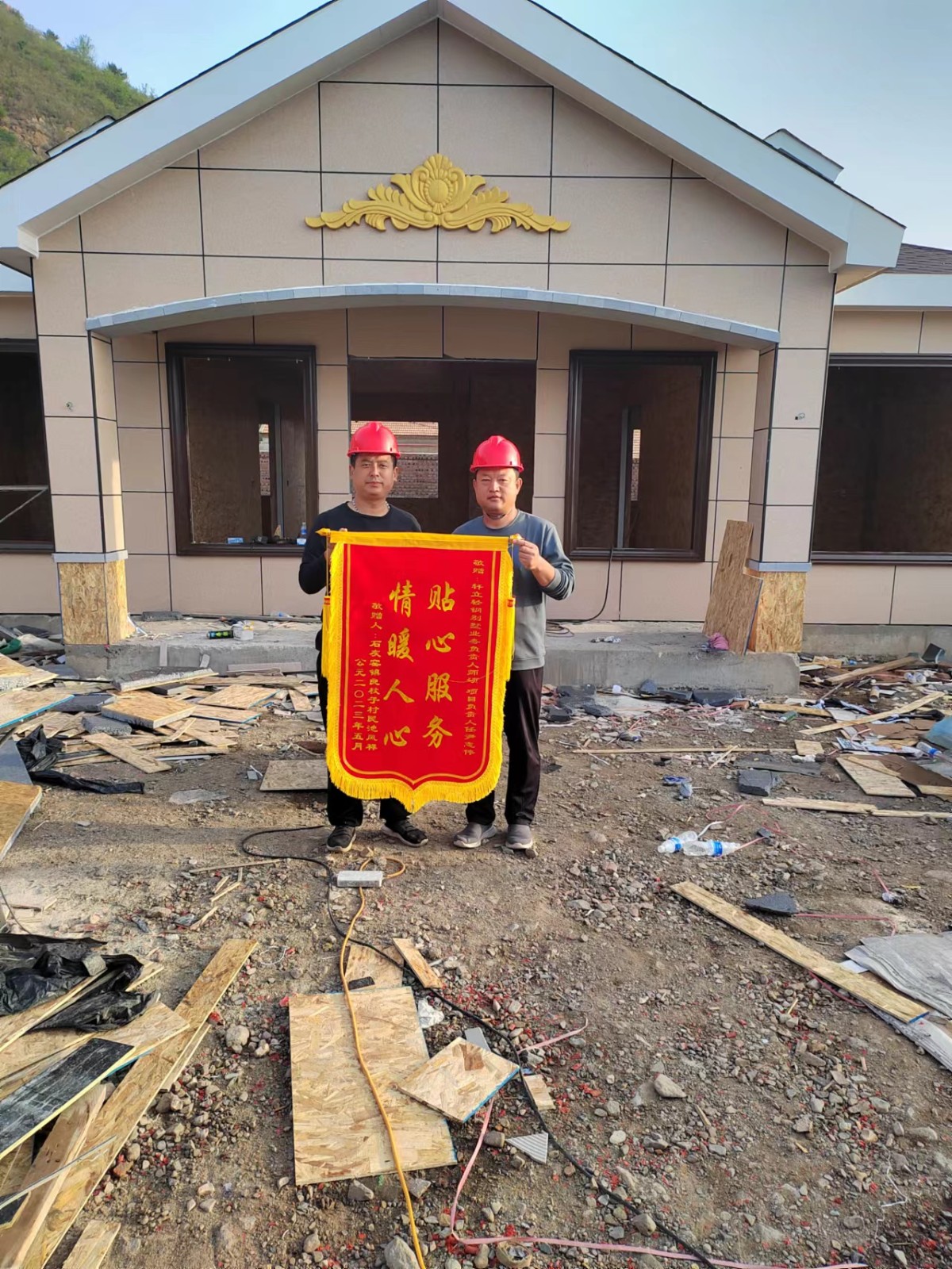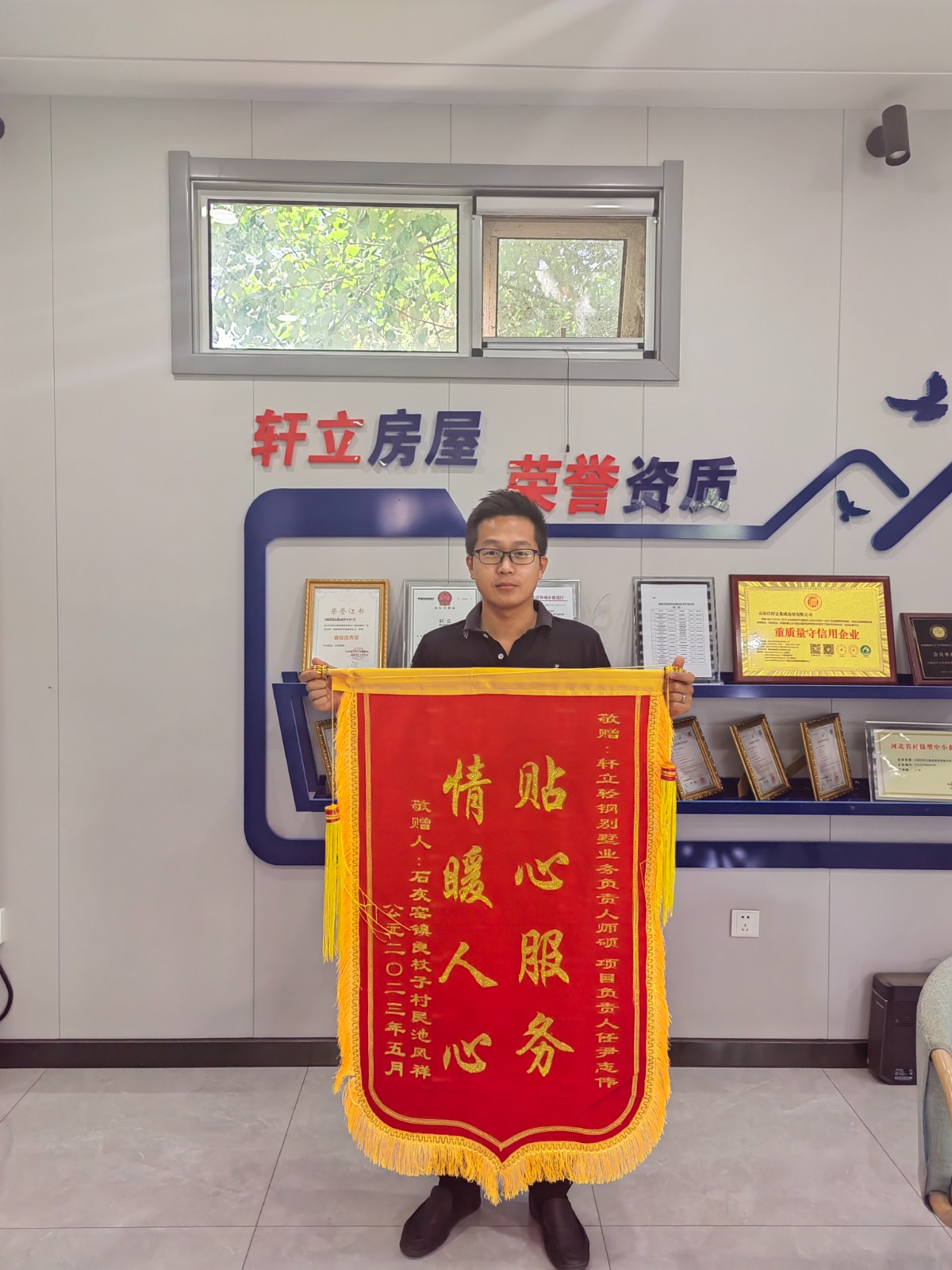5月23號軒立業(yè)務(wù)經(jīng)理師碩及項目經(jīng)理尹志偉收到了來自承德市承德縣石灰窯鎮(zhèn)良杖子村業(yè)主池風(fēng)祥先生送來的致謝錦旗,業(yè)主家為一層117.1平方米的四室兩廳一衛(wèi)輕鋼別墅,目前主體已經(jīng)完工,窗戶及入戶門還未安裝,雖未見完工后的效果,業(yè)主池先生就已經(jīng)把錦旗送到項目部,由項目經(jīng)理將錦旗送回公司,池先生對項目經(jīng)理尹志偉的專業(yè)及業(yè)務(wù)經(jīng)理師碩的負責(zé)進行了高度的贊揚。