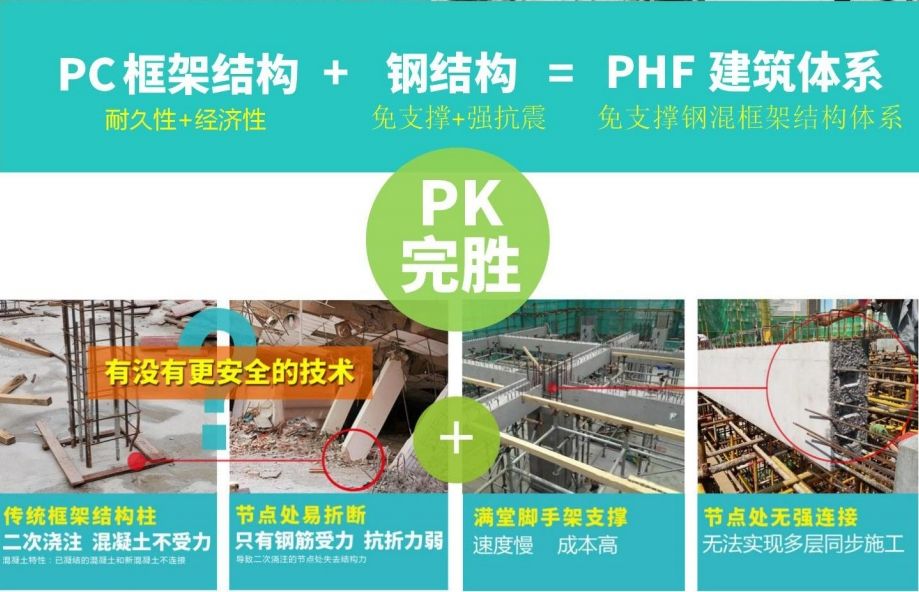 PHF建筑體系將 PC 構(gòu)件與鋼結(jié)構(gòu)連接方式有機(jī)結(jié)合、混合應(yīng)用,綜合了傳統(tǒng) PC 結(jié)構(gòu)和鋼結(jié)構(gòu)的優(yōu)勢(shì),揚(yáng)長(zhǎng)避短,施工更高效、效益更顯著。為行業(yè)開(kāi)辟了一條新的賽道。