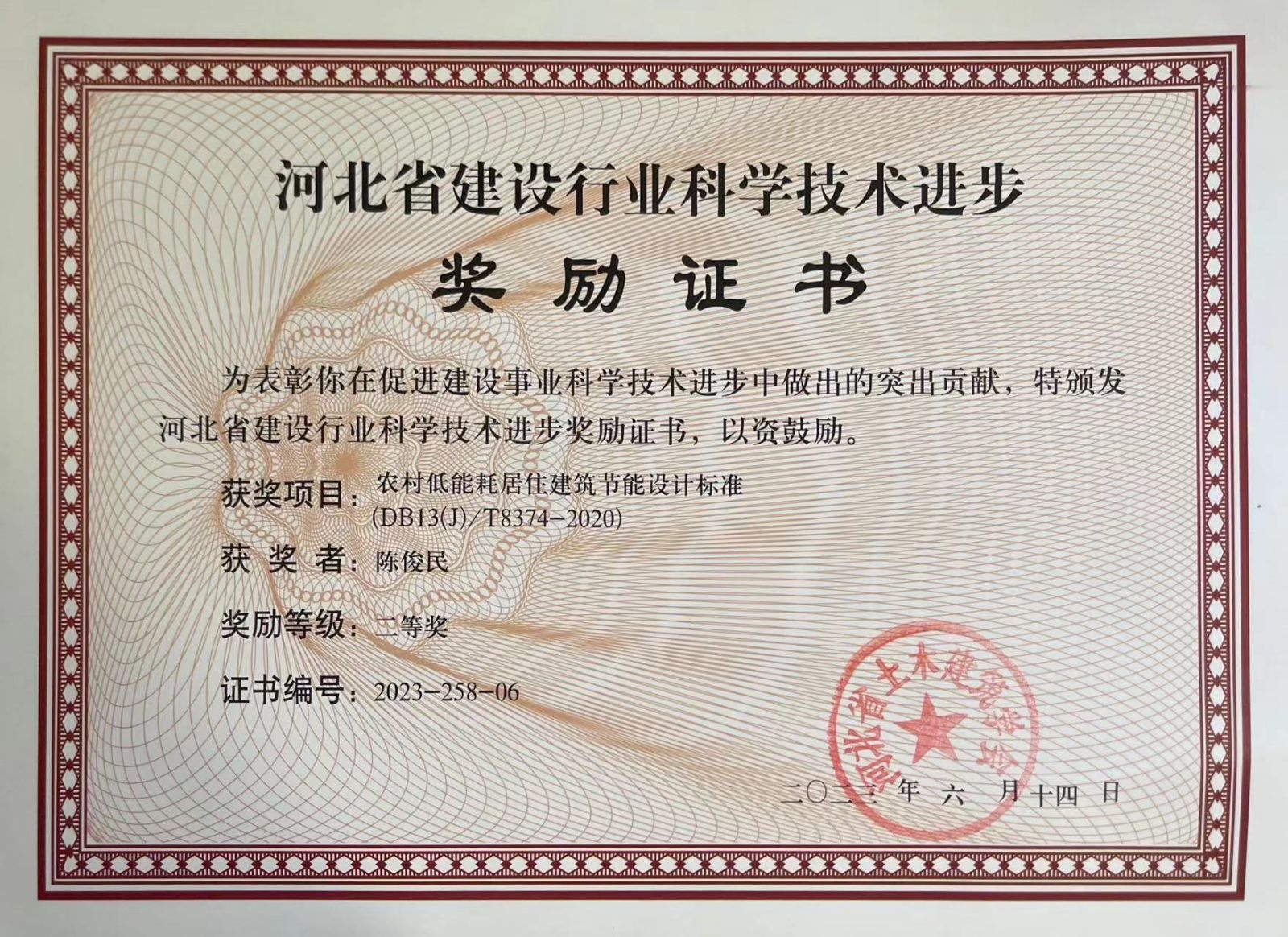 為表彰你在促進(jìn)建設(shè)事業(yè)科學(xué)技術(shù)進(jìn)步中做出的突出貢獻(xiàn),特頒發(fā)河北省建設(shè)行業(yè)科學(xué)技術(shù)進(jìn)步獎勵證書,以資鼓勵。以“農(nóng)村低能耗居住建筑節(jié)能設(shè)計標(biāo)準(zhǔn)”項目榮獲二等獎!