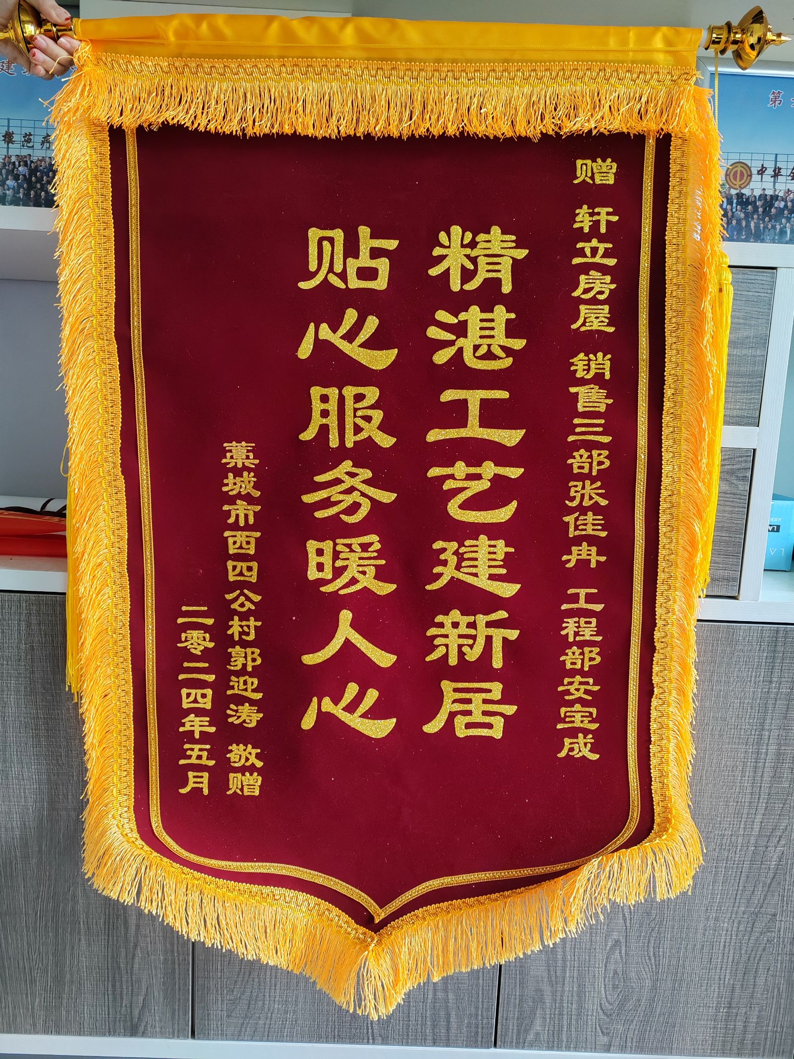 今天,我們收到了一面來自石家莊市藁城區(qū)業(yè)主郭先生送來的錦旗,上面寫著“精湛工藝建新居,貼心服務(wù)暖人心”。這面錦旗不僅是業(yè)主對軒立房屋精湛工藝和卓越服務(wù)的肯定,更是對軒立所有工作人員辛勤付出和專業(yè)技能的認可。